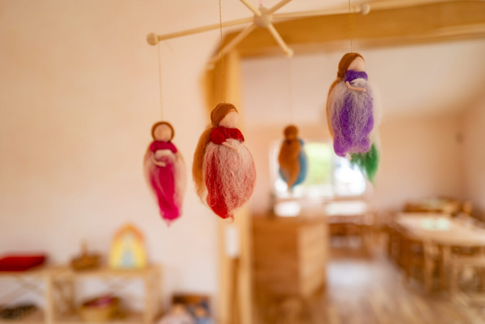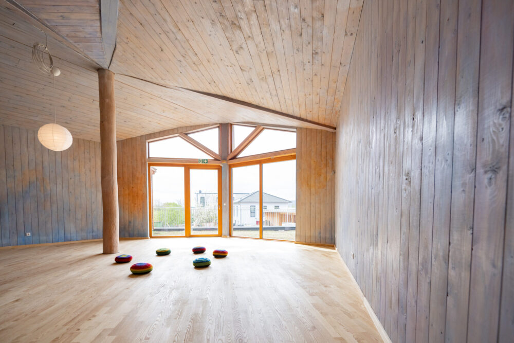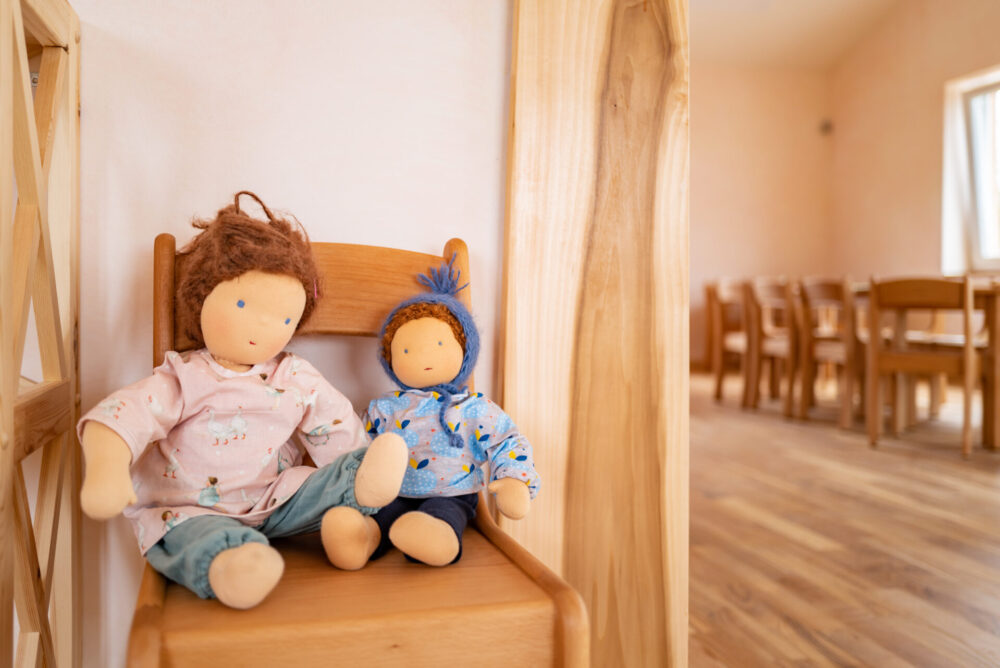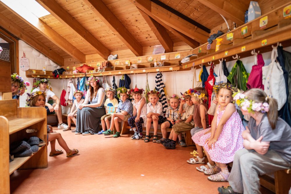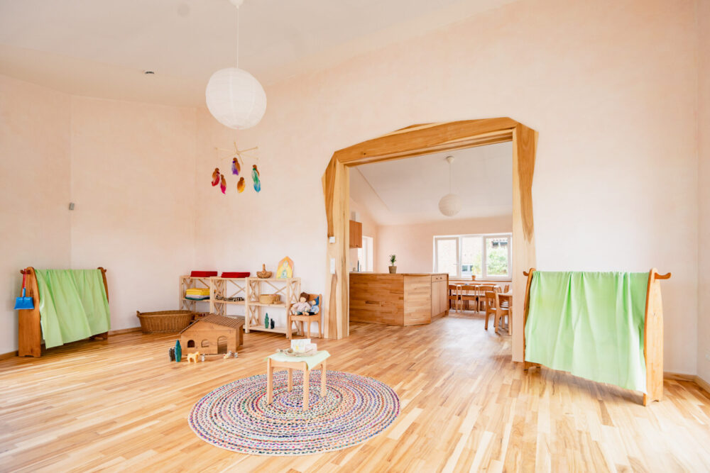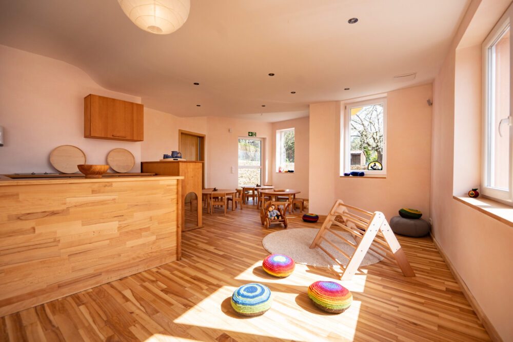 Es bietet im ersten Stock Platz für den Kindergartenbereich mit 25 Ganztagsplätzen für Kinder im Altern von 3 bis 6 Jahren. Über den freundlichen Eingangsbereich mit Panoramablick auf den Deister, in dem rechts eine lichtdurchflutete Halle zu Eurythmie, Elternabende und größere Veranstaltungen einlädt, führt es links an der hellen Garderobe und dem separaten Toilettenbereich vorbei zu dem großen Gruppenraum der Kindergartenkinder. Dieser gliedert sich in einen Wohn- und Essbereich. Hier werden die Kindergartenkinder von drei Pädagog:innen in der Zeit von 7.30 Uhr – 15.30 Uhr betreut.